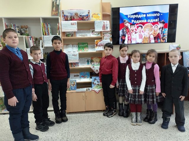 Богатыревская сельская библиотека с учащимися начальных классов провела тематический час «Народов много - Родина одна». В ходе мероприятия школьники познакомились с разными народами, населяющими Россию и нашу Республику. Узнали, что на её территории проживает более 180 различных национальностей, народностей, этнических групп и все они являются россиянами. Каждый из народов России отличается по языку, укладу жизни, обычаям, историческим традициям, религии, культуре, а также по трудовой деятельности. Дети узнали о национальных особенностях русских, чуваш, мордвы, татар и других народов России. Ребята приняли активное участие в викторине о различных символах нашей страны «Это встретим в России». В завершении мероприятия посмотрели мультфильм «В яранге горит огонь», созданный по мотивам северных народных сказок.